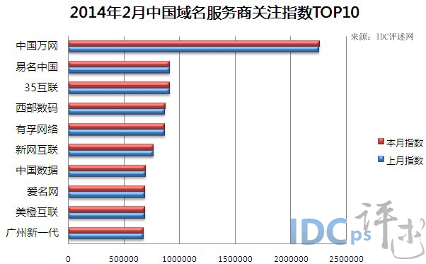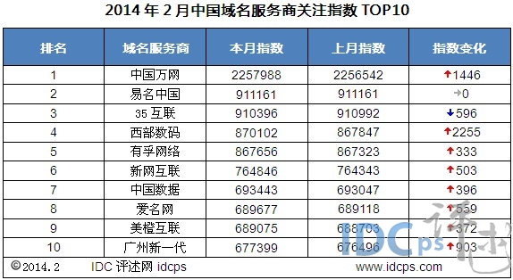 域名服务商2月关注指数前10:万网第一,西部数码涨幅最大