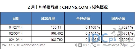 2月上旬美橙互联域名注册量动态:净减349个 重庆域名(www.023dns.com)消息, 根据域名统计机构WebHosting.info数据,截至2014年2月10日,美橙互联域名相比1月底净减349个域名,国内市场份额小降至2.7007%,总量为198,762个。下面,重庆域名(www.023dns.com)与大家一起关注2月上旬美橙互联域名增长情况。 2月上旬美橙互联域名注册量走势,如下图所示: 从图中我们可以看出,根据域名走势曲线分析,2月第一周(1月28日-2月3日)期间美橙互联域名呈负增长,降幅明显,总量下跌至19.84万。好在随后一周,域名总量回升。在2月上旬(1月28日-2月10日)期间,美橙互联域名增势前景不太明朗,增长态势此起彼伏,域名整体呈现出负增长的状态。 美橙互联域名增长数据,如下图所示: 从上面图中我们能够知道,在2月上旬期间,美橙互联域名增量呈出下滑的趋势,域名净减349个域名,总量从199,111个下降至198,762个。在全球域名市场上,份额小降。在国内,市场份额也呈现出小幅下滑的趋势。 综合以上最新数据,美橙互联2月上旬域名净减349个,国内市场份额下滑至2.7007%。 |