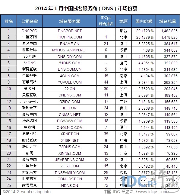中国域名服务商2014年1月份Top25榜单 重庆域名(www.023dns.com)消息, 2014年新春伊始,我国域名服务商市场仍然不失本色,没有太大变化,基本保持稳定。根据WebHosting.info数据显示,1月份,DNSPOD继续蝉联榜首,然而市场份额也依然呈现下滑的趋势,本期份额环比去年末下滑0.59%,至20.1728%。而紧随其后的中国万网,份额则突破20%,上涨0.19%,至20.1279%,两者之间呈现出此消彼长的状态,但是在差距不断缩小。而除此之外,不容小觑的还有51DNS,上升势头强劲。本期51DNS名次已经跃升至第6名,份额大涨0.82%。下面,重庆域名(www.023dns.com)就和大家一起关注1月份中国域名服务商Top25。 1月份,DNSPOD(DNSPOD.NET)域名环比上月净减36,801个,份额下滑0.59%,至20.1728%,持有量为1,482,826个。排名第二的的是中国万网(HICHINA.COM),域名份额上涨0.19%,至20.1279%,总量从上月的1,459,443个增至1,479,520个,新增20,077个。排名第三的易名中国(ENAME.CN),份额上涨至5.2325 %。西部数码(MYHOSTANMIN.NET)第四,份额升至4.68%。排名第五的35互联(DNS-DIY.COM),市场份额下滑至4.4605 %。具体如下图所示: 在这一次国内域名服务商Top25入围名单中,除51DNS(51DNS.COM)上升3名,有孚网络(YOVOLE.COM)则下滑了2名,新网互联(DNS.COM.CN)下滑1名外,剩下的域名服务商的排名与上月基本一样。 |