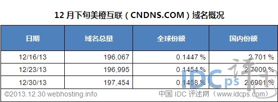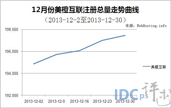 12月下旬美橙互联域名注册量动态:净增1387个 重庆域名(www.023dns.com)消息 , 根据WebHosting.info数据,截至2013年12月30日,美橙互联域名相比12月上旬净增1,387个域名,然而国内市场份额仍小降至2.6981%,总量增至197,454个。下面,重庆域名(www.023dns.com)就和大家一起关注12月下旬美橙互联域名增长情况。 12月份美橙互联域名注册量走势,如下图所示: 从图中我们可以看出,美橙互联域名12月份增势良好,域名增长趋向平稳。在12月下旬(12月17日-12月30日)期间,根据域名走势曲线分析,美橙互联域名增长没有太大变化,较为平稳,增幅明显,增量一般。域名总量就快突破19.8万个。 美橙互联域名增长数据,如下图所示: 在12月下旬期间,美橙互联域名增量呈现出上升的趋势,域名净增1,387个域名,总量从196,067个增长至197,454个。在全球域名市场上,份额上涨。在国内,市场份额却呈现出小幅下滑的趋势。 综合以上最新数据,美橙互联域名12月下旬净增1,387个,国内市场份额小降至2.6981%。 |