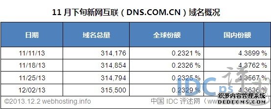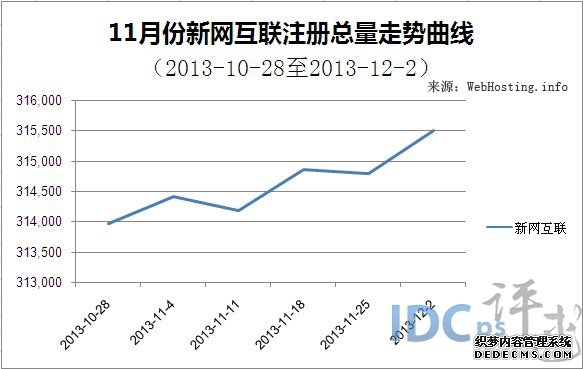 新网互联11月下旬域名注册量动态:净增1324个 重庆域名(www.023dns.com)消息, 据WebHosting.info最新数据,截至2013年12月2日,新网互联域名相比11月上旬净增了1,324个域名,总量增长至315,500个,相比11月上旬净增了1,324个域名,然而国内市场份额依然下滑到4.3636%。下面,重庆域名(www.023dns.com)与大家一起关注11月下旬新网互联域名增长情况。 新网互联11月份域名注册量走势,如下图所示: 从上图中我们能够看出,11月份,新网互联域名整体增势还算比较良好,但是增长并不稳定,增势此起彼伏。在11月下旬(11月11日-12月2日)期间,根据域名走势曲线分析,新网互联域名增长呈现出上升的趋势,增幅较为的明显。域名总量增至31.55万个。 新网互联域名增长数据,如下图所示: 新网互联在11月下旬期间,域名增量呈现出上升的趋势,域名净增1,324个域名,总量从314,176个增长至315,500个。在全球域名市场上,份额小升。但在国内,市场份额呈现出下滑的趋势。 综合以上最新数据,新网互联域名11月下旬,净增1,324个,国内市场份额下滑至4.3636%。 |
