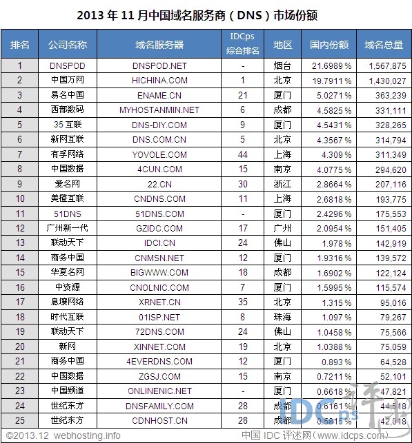 中国域名服务商2013年11月份Top25 重庆域名(www.023dns.com)消息,一年即将过去,国内各域名服务商也逐渐的骚动起来,纷纷打起了优惠战,以便抢占市场。根据WebHosting.info数据,在国内域名服务商市场上11月份,,DNSPOD依然继续稳居榜首,然而份额环比上月下滑0.55%,至21.6989%。中国万网排名紧随其后,份额亦呈现下滑的趋势,小降0.09%,至19.7911%。而特别值得关注的是51DNS,份额大涨1%,上升势头尤为强劲,已蹿升至第11名。下面,重庆域名(www.023dns.com)就带大家一起关注中国域名服务商11月份Top25。具体排名如下所示: DNSPOD(DNSPOD.NET)11月份,域名环比上月净减11,396个,持有量为1,567,875个,份额下滑0.55%,至21.6989%。中国万网(HICHINA.COM)排名第二,域名新增19,181个,总量从上月的1,410,846个增至1,430,027个,然而份额仍小降0.09%,至19.7911%。排名第三的是易名中国(ENAME.CN),份额小升至5.0271%。排名第四的是西部数码(MYHOSTANMIN.NET),份额小升至4.5825%。35互联(DNS-DIY.COM)降至第五,份额下滑至4.5431%。 在这一次国内域名服务商Top25入围名单中,各域名服务商排名变动稍大。其中,51DNS(51DNS.COM)上升5名,升幅最大,西部数码(DNS.COM.CN)上升1名。本期,除51DNS特别值得关注之外,还有一家重新跻身进榜单的服务商——中国频道(ONLINENIC.NET),位列第23名。而原本上月排名第25位的耐思尼克(NDNS.CN),由于中国频道的强势回归,黯然退出11月份的前25强名单。 而联动天下(IDCI.CN)、35互联(DNS-DIY.COM)、 广州新一代(GZIDC.COM)、中资源(CNOLNIC.COM)、商务中国(CNMSN.NET)、华夏名网(BIGWWW.COM)、世纪东方(DNSFAMILY.COM/ CDNHOST.CN)都全部下降了1名。 上一条: 美橙互联支招:实用的域名注册指南 |