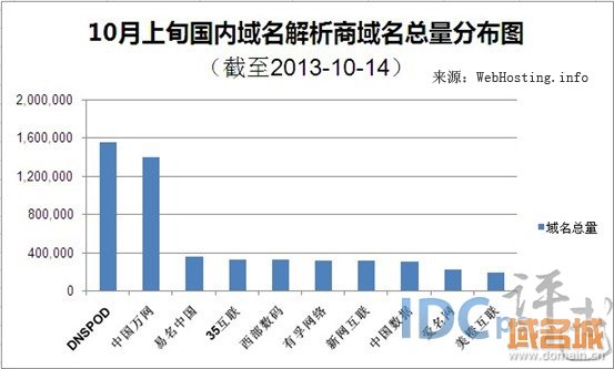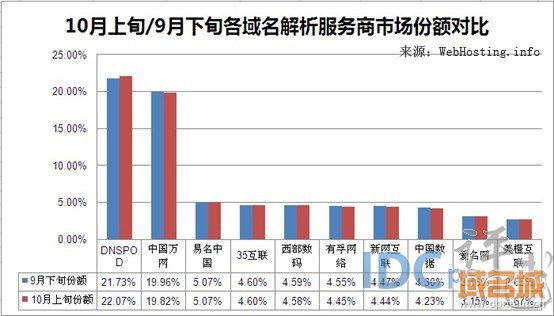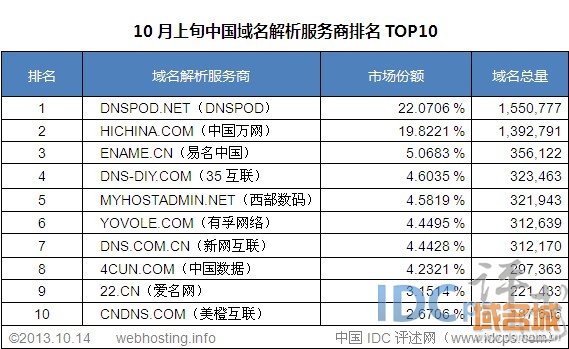 国内域名解析服务商10月上旬Top10 重庆域名(www.023dns.com)消息, 据WebHosting.info数据,截至2013年10月14日,国内域名解析服务商市场没有太大的变化,基本保持稳定。与9月底相比,DNSPOD份额再涨0.34%,达22.0706%。而中国万网排名紧随其后,份额下降了0.14%,至19.8221%。两者差距不断拉大。下面,重庆域名(www.023dns.com)与大家一起关注10月上旬国内域名解析服务商市场。 各域名解析服务商域名总量分布图(截至2013-10-14),如下所示: 从上图中我们可以看出,国内域名解析服务商10月上旬,Top10分别是:DNSPOD、中国万网、易名中国、35互联、西部数码、有孚网络、新网互联、中国数据、爱名网和美橙互联。 在域名总量对比上,DNSPOD以微弱优势领跑国内域名解析商市场,与中国万网差距不是特别大。排名第三的易名中国,与随后的35互联和西部数码差距也同样不是很大,竞争尤为的激烈。 下面,我们再来分析国内域名解析服务商Top10具体数据: 各域名服务商市场份额对比图,如下所示: 10月上旬中国域名解析服务商排名TOP10(截至2013-10-14),如下图所示: 从上面两图的数据我们可以看出,截至10月14日,DNSPOD域名相比9月底新增33,675个,持有量增至1,550,777个,份额上涨0.34%。中国万网排名紧随其后,域名环比净减481个,总量为1,392,791个,份额下滑近0.14%。排名第三的是易名中国,份额小降至5.0683%。排名第四的是35互联,份额升至4.6035%。 综合以上最新数据,国内域名解析服务商10月上旬,市场基本保持稳定,没有太大变化。DNSPOD增势良好,继续蚕食中国万网等域名解析商份额。而中国万网,显然,低潮期依然没有过去,前景堪忧。与9月底相比,各域名解析服务商之间的排名没有变动。 |