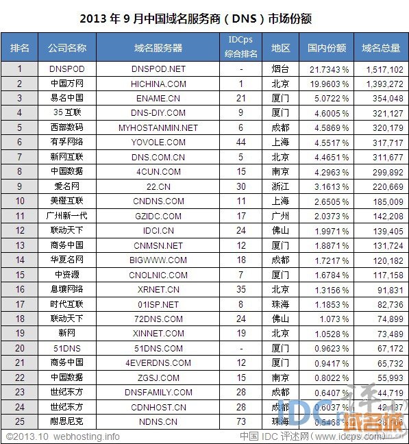 中国域名服务商2013年9月份Top25 重庆域名(www.023dns.com)消息, 根据WebHosting.info最新数据,国内域名服务商9月份,市场基本保持稳定,没有太大的变化。DNSPOD继上月超越中国万网问鼎国内域名榜首之后,份额继续平稳的上升,攀升至21.7343%。而排名跌落至第二的中国万网,显然,低潮期依然没有过去,份额年内首次跌破20%,为19.9603%创新低。下面,重庆域名(www.023dns.com)与大家一起关注9月份中国域名服务商Top25。具体排名如下所示: DNSPOD(DNSPOD.NET)9月份,域名环比上月净增80,609个,持有量增至1,517,102个,份额上涨0.74%,至21.7343%。中国万网(HICHINA.COM)排名第二,域名新增2,816个,份额环比下滑0.36%,至19.9603%,总量从上月的1,390,456个增至1,393,272个,。排名第三的易名中国(ENAME.CN),份额增至5.0722%。重夺第四的35互联(DNS-DIY.COM),份额小降至4.6005%。西部数码(MYHOSTANMIN.NET)升至第五,份额升至4.5869%。 在这次国内域名服务商Top25入围名单中,各域名服务商排名变动稍微有点大。其中,51DNS(51DNS.COM)上升2名,35互联(DNS-DIY.COM)、西部数码(MYHOSTANMIN.NET)和广州新一代(GZIDC.COM)各上升1名。而特别值得注意的是,耐思尼克(NDNS.CN)新跻身进前25强,位列第25名。 而原本上个月排名第25位的新网(EXPIRENOTIFICATION.COM),由于受到耐思尼克的冲击,9月份,黯然退出了前25强名单。有孚网络(YOVOLE.COM)下滑2名,联动天下(IDCI.CN)、商务中国(4EVERDNS.COM)和中国数据(ZGSJ.COM)则各下降1名。 |