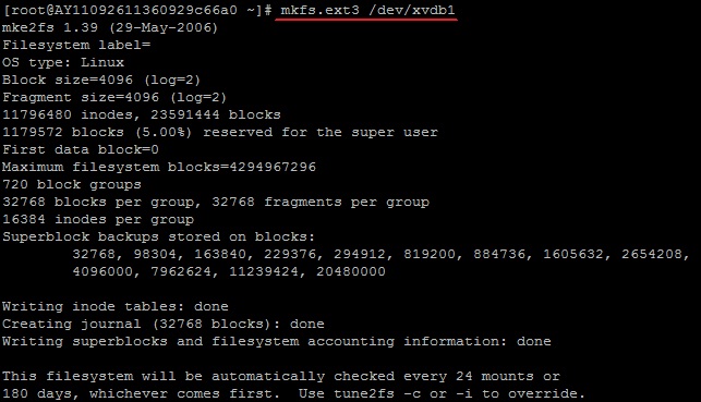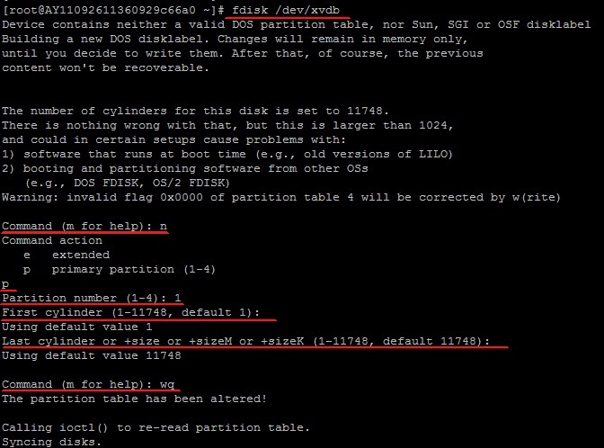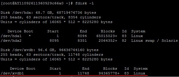 适用系统:非IO优化+SSD云盘Linux( CentOS,Debian,Ubuntu,Redhat )实例,IO优化实例+SSD云盘数据盘分区挂载建议使用脚本工具:auto_fdisk_ssd.sh * Linux的云服务器数据盘未做格式化与分区,可以根据以下步骤进行格式化与分区操作。 下面的操作将会把数据盘划分为一个分区来使用。 1、查看数据盘 在没有格式化与分区数据盘前,使用 “df –h”命令是无法看到数据盘的,可以使用“fdisk -l”命令查看。如下图所示: 温馨提示:若您执行fdisk -l命令,发现没有 /dev/xvdb 表明您的云服务无数据盘,那么您无需进行挂载,此时该教程对您不适用 2、 对数据盘进行分区 执行“fdisk /dev/xvdb”命令,对数据盘进行分区; 根据提示,依次输入“n”,“p”“1”,两次回车,“wq”,分区就开始了,很快就会完成。 3、 查看新的分区 使用“fdisk -l”命令可以看到新的分区xvdb1已完成建立。 4、格式化新分区 以ext3为例:使用“mkfs.ext3 /dev/xvdb1”命令对新分区格式化,格式化的时间根据硬盘大小是不相同的。 (也可自主决定选用其它文件格式,如ext4等) 5、添加分区信息 使用“echo '/dev/xvdb1 /mnt ext3 defaults 0 0' >> /etc/fstab”(不含引号)命令写入新分区信息。 然后使用“cat /etc/fstab”命令查看,出现以下信息就表示写入成功。 注意:ubuntu12.04不支持barrier,所以正确写法是:echo '/dev/xvdb1 /mnt ext3 barrier=0 0 0' >> /etc/fstab * 如果需要把数据盘单独挂载到某个文件夹,比如单独用来存放网页,可以修改以上命令中的/mnt部分 6、挂载新分区 使用“mount -a”命令挂载新分区,然后用“df -h”命令查看,出现以下信息说明成功挂载,可以开始使用新分区。 >>Linux FTP服务配置 >>linux一键安装web环境全攻略 >>硬盘分区和格式化for Windows 2008 上一条: 无上一篇
