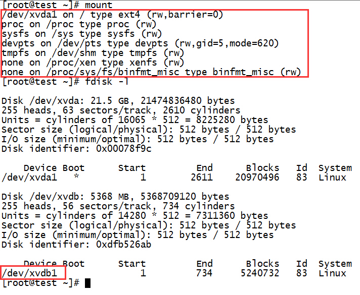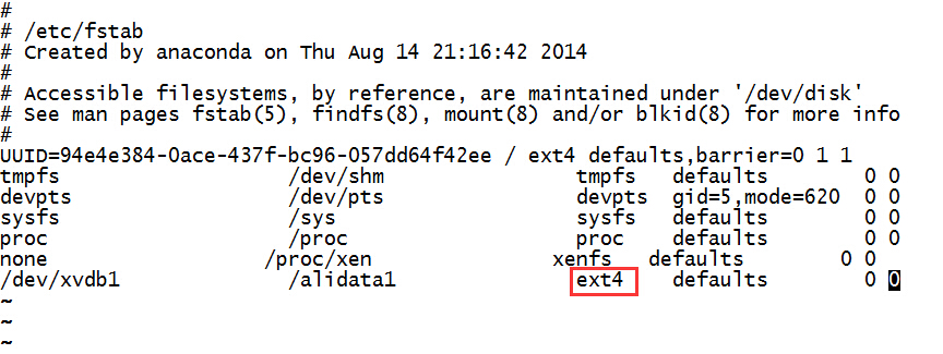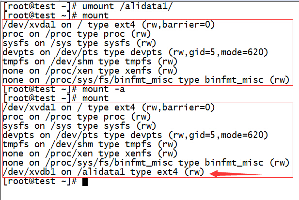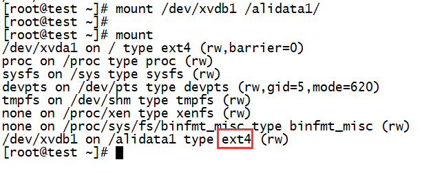 问题:如果服务器需初始化系统,数据盘的数据不需改变,初始化服务器后需对数据盘重新挂载。 1、输入mount命令可看到并没有挂载数据盘,输入fdisk -l 命令,看到已经分区的数据盘 /dev/xvdb1 (设备编号以实际情况为准)。 请注意:新购买数据盘分区格式化请参考:http://help.aliyun.com/knowledge_detail/5974154.html?spm=5176.776512192.0.0.Bu5NtI&categoryId= 2、输入命令mount /dev/xvdb1 /目录,下面的例子是挂载到了/alidata1 目录上,这个目录需按照各自实际需要挂载的目录填写,这里只是举例。 挂载后再输入mount命令可看到数据盘已挂载,并且格式是ext4。 3、修改/etc/fstab自动挂载文件,增加数据盘挂载条目,分区类型是ext3还是ext4要注意与刚才执行mount命令看到的类型相对应。 4、最后可使用umount命令卸除磁盘挂载,再重新使用mount -a 命令查看是否可以自动挂载上。 上一条: Linux系统云服务器使用教程 下一条: Linux查看实时带宽流量情况的说明