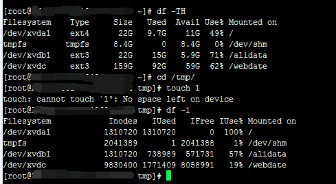 问题现象,使用Linux命令df -TH查看磁盘发现还是有很多空间的,但是使用touch创建文件却提示"磁盘上没有足够的空间",再使用df -i查看inode的使用情况,发现/dev/xvda1盘inode的使用已经100%了,于是造成了这个错误。如下图所示: 检查处理该问题的方法为: 1 查找出某个文件夹下的大量小文件,一般可以排除以下目录的: 1.1、/var/log/ 1.2、/tmp 1.3、/var/lib/yum/ 1.4、系统中其他程序的日志目录,以阿里云一键安装脚本为例: Apache 访问日志在: /alidata/log/apache/access 错入日志在: /alidata/log/apache/ Nginx 访问日志在:/alidata/log/nginx/access 错误日志在 : /alidata/log/nginx/ 2 使用以下命令分别在不同的文件夹下执行,找出文件数最多的文件夹。 ls -lR | grep "^-" | wc -l 3. 通过rm 命令可删除对应的文件,例如: rm -rf /var/log/httpd/access 将会删除/var/log/httpd/access目录及其下所有文件和文件夹。 然后再尝试重新创建文件即可。