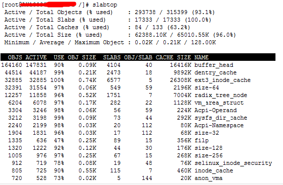 可ssh远程连接登录到服务器,输入命令slabtop来分析具体内存分配情况,如下图: slab机制可以管理分配内存,如您想尽快回收则可执行如下命令: #sync;sync;sync #echo 2 > /proc/sys/vm/drop_caches 等内存回收完毕后再执行以下命令: #echo 0 > /proc/sys/vm/drop_caches 其中drop_caches的4个值有含义如下所示: 0:不做任何处理,由系统自己管理 1:清空pagecache 2:清空dentries和inodes 3:清空pagecache、dentries和inodes