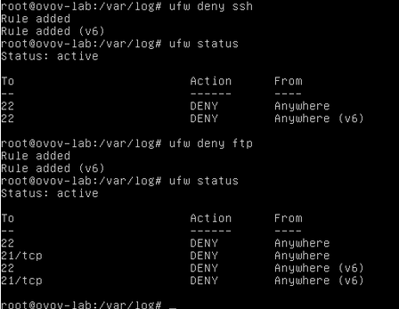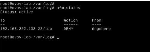 ufw是Ubuntu下的一个简易的防火墙配置工具,底层是调用iptables来处理的,虽功能较为简单,但对桌面型应用来说是比较实用的,有基本的常用功能,使用较为容易。 这里介绍几种ufw常见的用法: 请注意:此处的操作都是使用root用户来进行的。 1、查看当前ufw状态: ufw status 2、启用和禁用ufw: 启用ufw:ufw enable 禁用ufw:ufw disable 3、允许出方向的端口,这里已udp协议53端口为例: ufw allow out 53/udp 4、禁止某个IP地址访问,以192.168.254.254为例: ufw deny from 192.168.254.254 5、基于服务的配置,如 ufw deny ssh. 效果如下图: 6、拒绝所以主机链接到SSH的22端口。如下图: 7、开启ufw log的方式为:ufw logging on log目录在/var/log/ufw.log 更多内容可以man ufw