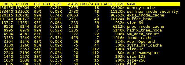 然后再通过SLAPTOP来查看是哪里占用的并相应解决。执行slabtop命令后结果显示如下所示,可查看到使用内存高的进程。