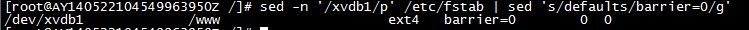 在Debian或Ubuntu系统中,如发现磁盘为只读,可按以下方法检查/etc/fstab中是否设置barrier=0 请注意:只读的情况例如执行命令 touch 1.txt 系统报错read only 1、登陆Linux 2、输入命令 more /ets/fstab 如是如下所示状态: 这需将只读磁盘那一行的default替换成barrier=0 3、将磁盘卸载,重新挂载 例如:上述截图中的例子,操作方法如下: sed -n '/xvdb1/p' /etc/fstab | sed 's/defaults/barrier=0/g' 然后输入 umount /www mount -a 上一条: ECS Linux服务器下解压缩大于4G的ZIP压缩文件 下一条: ECS Linux挂载Windows共享文件夹提示“wrong fs type bad option bad superblock”错误的分析解决