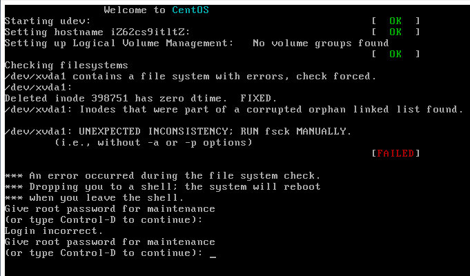 ECS Linux服务器因为开机磁盘无法通过检查导致无法启动的解决办法