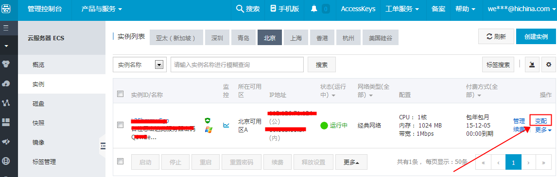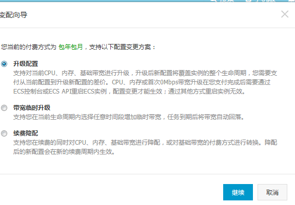 问题描述: 阿里云ECS Linux服务器,站点程序不能运行,排查发现数据库未启动。启动MySQL服务时,提示报错信息Out of memory。 该类问题一般是由于基础环境配置不当或硬件配置不能满足当前服务需求导致,如MySQL配置错误,内存不足等。 针对该类问题,排查思路如下: 1、检查是否为基础服务问题,如对MySQL的最小内存设置进行检查。如果不熟悉数据库调整,可以卸载后重新进行安装恢复默认配置。 2、 若当前硬件配置较低,如只有512M或1G内存,则可以考虑升级内存后,验证问题是否解决。硬件配置变更升级操作方法如下所示: 1)登陆阿里云控制台,点击【实例】--在要升级的服务器右侧,点击变配。 2)弹出的界面中,选择【升级配置】,点击【继续】。 3)置要升级的内存大小或CPU核数,点击【去升级】。