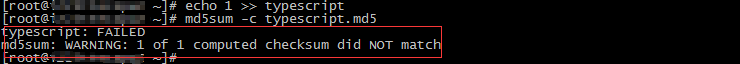 MD5算法常被用来验证网络文件传输的完整性,若源文件的md5值与目的端文件的md5值是一致的,那么就说明传输的文件是完整的,若不一致,则需重传。 可通过执行md5sum 文件名查看此文件的md5信息,如md5sum typescript 也可将md5信息写入文件,如md5sum typescript > typescript.md5 md5sum重要参数 -c 根据已生成的md5值,对现存文件进行校验 -b 以二进制模式读入文件内容 -t 以文本模式读入文件内容 以-c为例,执行md5sum -c typescript.md5 进行验证,通过会出现OK的提示 验证失败出现 typescript: FAILED md5sum: WARNING: 1 of 1 computed checksum did NOT match 上一条: Linux 怎样保存用户登录操作命令记录 下一条: Linux下通过rm -f删除大量文件时提示"-bash: /bin/rm: Argument list too long"错误的分析解决