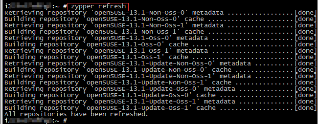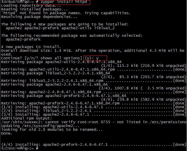 SUSE系统无yum命令,若需安装软件可使用zypper,功能类似Debian下的apt-get,可先执行zypper refresh 刷新软件源 执行zypper install 软件名,安装软件以安装apache为例,执行zypper install httpd,出现continue提示后输入y回车继续安装。 1、zypper的几个重要选项: 选项 说明 repos, lr 列出库 clean 清除本地缓存 refresh, ref 刷新所有安装源 addrepo, ar 添加库 modifyrepo, mr 修改指定的安装源 renamerepo, nr 重命名指定的安装源 2、 zypper的查询选项: 选项 说明 search, se 安装软件包 patterns, pt 列出所有可用的模式 what-provides, wp 列出能够提供指定功能的软件包 packages, pa 列出所有可用的软件包 products, pd 列出所有可用的产品 3、 zypper软件管理: 选项 说明 remove, rm 删除软件包 install, in 安装软件包 update, up 更新已安装的软件包到新的版本 verify, ve 检验软件包依赖关系的完整性