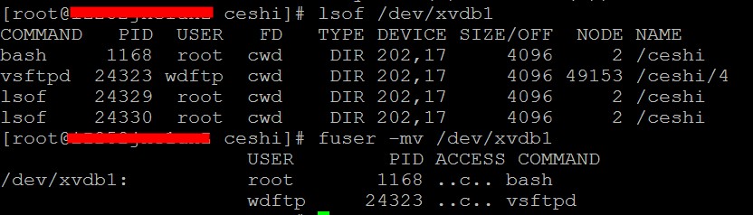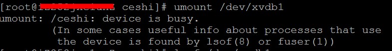 umount磁盘提示“device is busy” 本文以卸载 /dev/xvdb1 为例 如下图要卸载 /dev/xvdb1 这块磁盘报错 这个是有程序正在使用此磁盘,可用 lsof /dev/xvdb1 或 fuser -vm /ceshi/ 查看是哪个进程在占用,如下图所示: 查看到一个是pid为1168的bash进程,一个是pid为24323的vsftpd进程在占用,然后关闭对应的服务或杀掉对应的进程就能够卸载成功。 如只是有一个单独的进程bash,通常是有用户登录在此目录下,退出此目录就行了。 另可尝试用强制卸载进行下操作,命令 umount -l /dev/xvdb1 device is busy是磁盘对文件的一个保护机制,以上操作前建议对磁盘文件进行备份之后再执行。