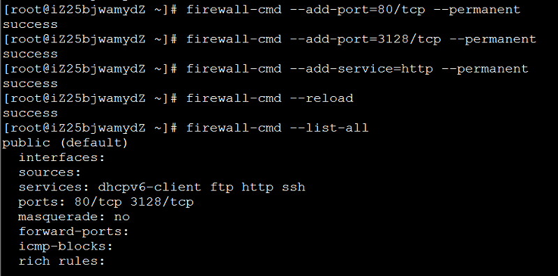Centos7下默认的防火墙是Firewall,替代了之前的iptables。 Firewall有命令行管理和图形界面管理两种方式,在此介绍下命令行Firewall的使用。 一、配置Firewall 进入系统之后,Centos7默认是已安装了Firewall,但没有启动,因此需先启动下Firewall,同时设置开机自启动 [root@iZ25bjwamydZ ~]# systemctl start firewalld ##启动Firewall [root@iZ25bjwamydZ ~]# systemctl enable firewalld.service ##设置开机自启动 ln -s '/usr/lib/systemd/system/firewalld.service' '/etc/systemd/system/dbus-org.fedoraproject.FirewallD1.service' ln -s '/usr/lib/systemd/system/firewalld.service' '/etc/systemd/system/basic.target.wants/firewalld.service' 二、常用命令介绍 firewall-cmd --state ##查看防火墙状态,是否是running firewall-cmd --get-zones ##列出支持的zone firewall-cmd --reload ##重新载入配置,比如添加规则之后,需要执行此命令 firewall-cmd --add-service=ftp ##临时开放ftp服务 firewall-cmd --remove-service=ftp --permanent##永久移除ftp服务 firewall-cmd --get-services##列出支持的服务,在列表中的服务是放行的 firewall-cmd --query-service ftp##查看ftp服务是否支持,返回yes或者no firewall-cmd --add-port=80/tcp --permanent ##永久添加80端口 firewall-cmd --add-service=ftp --permanent##永久开放ftp服务 iptables -L -n ##查看规则,这个命令是和iptables的相同的 查看帮助man firewall-cmd 三、使用示例 如临时添加 3128端口 永久添加http服务,永久添加80端口 请注意:Firewall支持zone,可更方便的定制化规则,更详细的内容,请参考官方文档