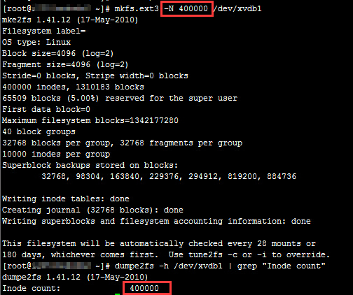 使用云服务器时,若业务上有较多的小文件需存储到服务器中,同时磁盘空间较小的情况下,可在首次格式化磁盘时指定磁盘中Inode节点数量。 参考命令: mkfs.ext3 -N number-of-inodes 磁盘设备 如: mkfs.ext3 -N 400000 /dev/xvdb1 结果如下: 请注意: 1、调整或设置Inode的操作可直接针对新的数据盘进行操作。 2、若是针对已格式化并保存有数据的数据盘,请您在备份数据后进行操作,避免磁盘格式化导致数据丢失。