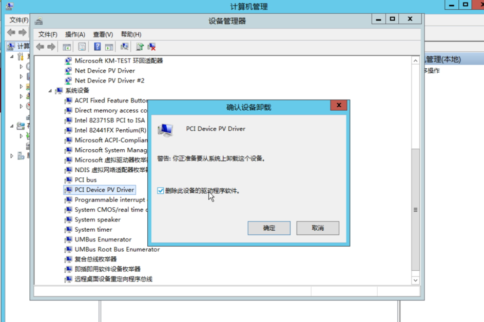 如何恢复Windows系统误卸载PVDriver导致断网 由于PVDriver程序提供了阿里云Windows云服务器相关虚拟硬件的驱动支持,因此请勿轻易将其卸载。如果用户误将PVDriver卸载,会导致虚拟网卡消失或者显示"已断开"无法联网。这时用户可尝试通过【管理控制台】中的【连接终端登陆】登陆到服务器,按照以下方法进行修复: 1. 对原有PVDriver信息进行清理,可以通过如下脚本: C:\Program Files (x86)\Xen PV Drivers\bin\driveruninstall.bat 2. 删除现有PVDriver设备,卸载【系统设备】下的【PCI Devicd PV Driver】,如下图所示: 注意:Windows Server 2008 系统,一并勾选"删除此设备的驱动程序文件"复选框 3. 删除C:\Program Files (x86)\Xen PV Drivers\文件夹 4. 重启系统 5.正常安装C:\WINDOWS\pvdriver目录下的 PVDriver驱动程序; 安装的时候,选择默认的"Typical"即可; 6.重启后,一般网卡都能恢复正常,但是IP地址变成自动获取的。可以手工根据控制台中的IP信息进行修改,或者工单反馈阿里云工程师,协助在后台进行配置重置。 如果问题还未能解决,请联系阿里云售后技术支持 。