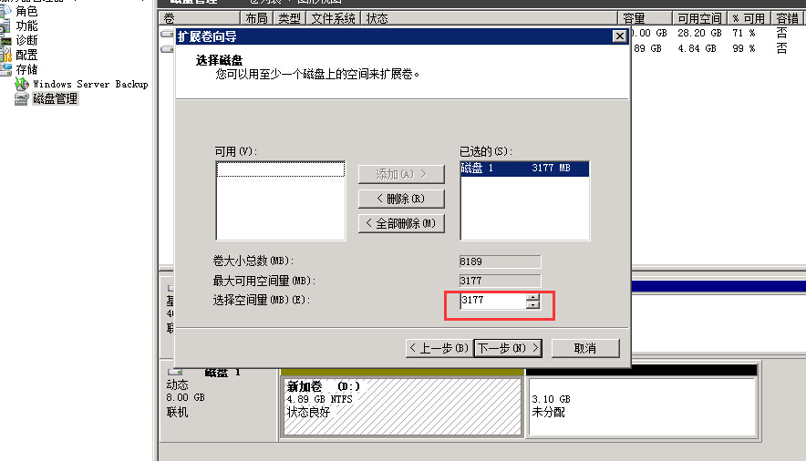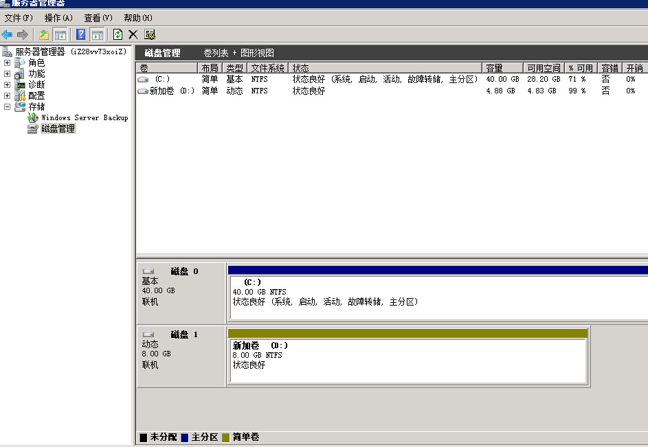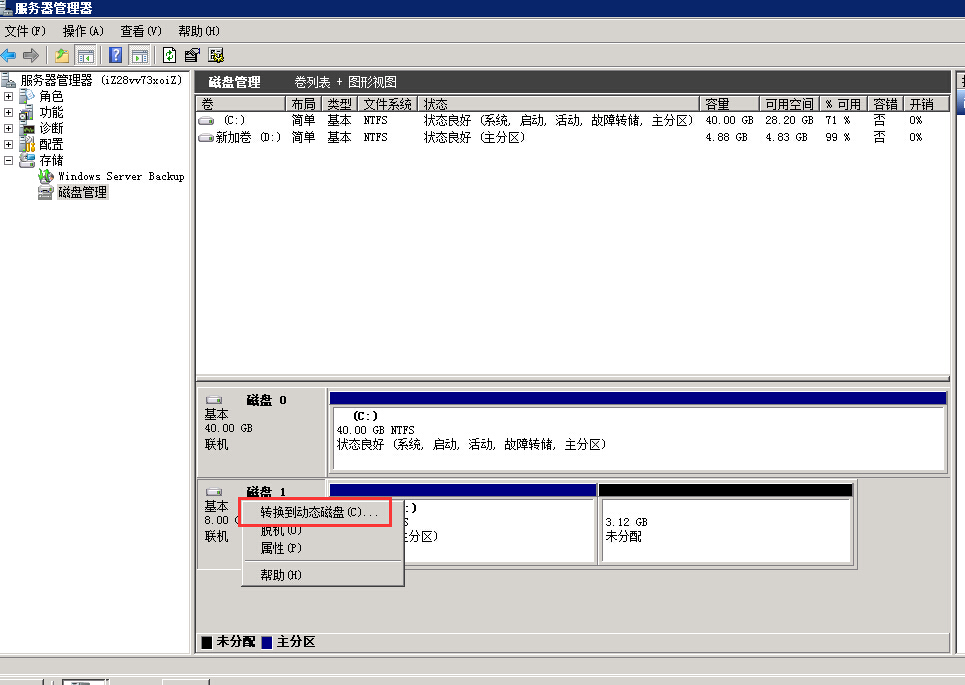 ECS Windows数据盘扩容后如何进行磁盘分区 当数据磁盘原地扩容后,数据盘虽然变大,但分区仍会和原来的大小一样,示例:原来5G的数据盘扩容到8G后会出现3G未分配空间。 注:操作前建议用户创建快照,以免操作错误导致数据丢失,快照创建方法点此查看 。 先右击数据盘,选择【转换到动态磁盘...】, 然后点击右键选择【扩展卷...】, 将剩余空间选中后分配点下一步分配完成。 操作后就可以看到数据盘已经扩容完毕,如下图所示: 如问题还未解决,请联系售后技术支持。