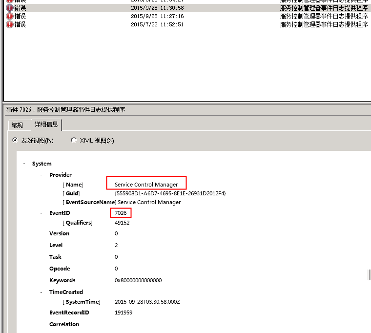 如何解决Windows2008系统事件查看器service control manager报错 通过事件查看器系统项有service control manager报错 id 7026,如下图所示: 开始,在运行中输入regedit进入注册表 依次打开 HKEY_LOCAL_MACHINE\SYSTEM\ControlSet001\Services\ 找到子目录00 c14722093 ,然后将其删除 可能存在键项:“HKEY_LOCAL_MACHINE\SYSTEM\ControlSet001\Services\ npkcrypt”或HKEY_LOCAL_MACHINE\SYSTEM\ControlSet002\Services\npkcrypt”等,如果存在也进行删除。 最后重启服务器,即可完成 如果问题还未能解决,请联系售后技术支持。