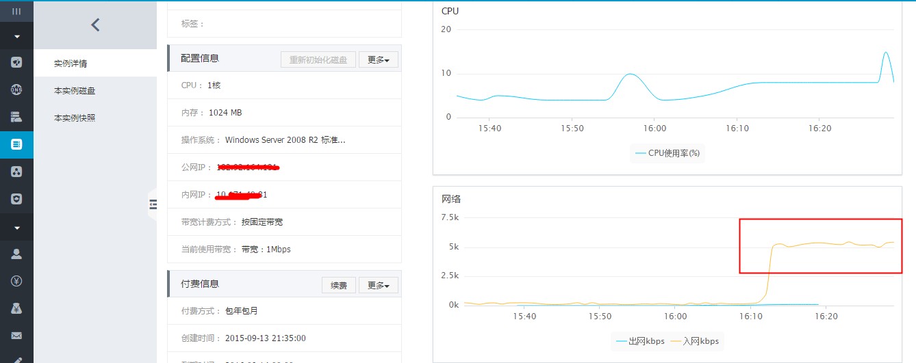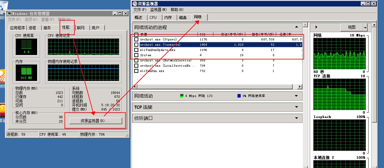 如何排查ECS Windows系统的服务器网络使用量高的问题 ECS Windows系统的服务器网络使用量高的问题排查方法: 用户反应在使用ECS主机时发现访问网站慢,并发现主机网络流量较大。如下图所示: 图中可以看到ECS服务器的入带宽使用量比较高。 请按如下步骤操作查明具体原因: 请用户使用远程桌面登陆服务器, 远程桌面使用方法如下: http://help.aliyun.com/knowledge_detail/5973938.html?spm=5176.7114037.1996646101.13.WLLZbz&pos=7 如果ECS服务器网络流量非常高,可能会导致无法连接远程桌面,此时,请您使用管理终端连接ECS主机。 管理终端的使用方法,请参考如下: http://help.aliyun.com/knowledge_detail.htm?knowledgeId=5974445 登陆服务器之后打开资源管理器 -> 性能 -> 资源监视器 -> 网络, 如下图所示: 由上图可以看到,进程1176的入流量是非常高的,它达到了607KB/s 左右, 1176进程是ftpsvc, 可以判断出此为FTP服务。应该还有用户在连接ftp,上传文件。 如果用户看到是w3wp.exe进程使用较高的流量,那么需要进一步分析web日志,查看具体原因。 可以使用weblog expert lite等工具进行web日志分析。具体分析方法,请参考帮助中心其他相关文档。 如果问题还存在,请联系阿里云售后支持。
