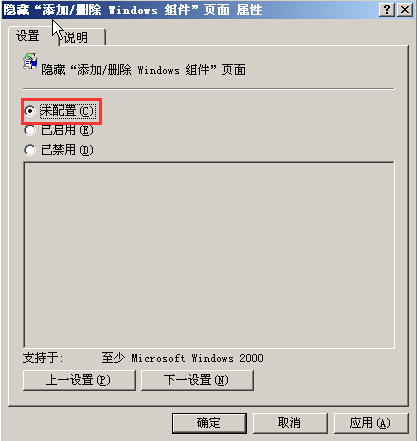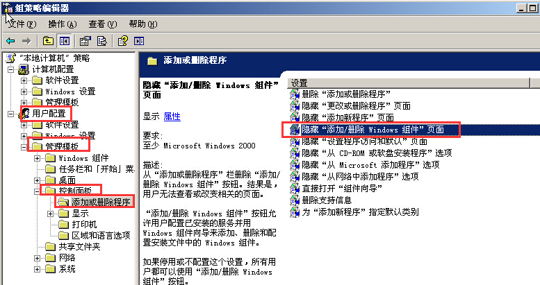 如何解决Windows 2003“添加或删除程序”中看不到“添加/删除Windows组件” 问题描述: Windows 2003服务器通过控制面板“添加或删除程序”功能安装应用的时候,不显示“添加/删除Windows组件”的按钮,导致安装无法操作, 解决方法: 1.首先点击开始-运行-输入gpedit.msc打开组策略。 2.点击用户配置-管理模版-控制面板-添加或者删除程序,在右侧找到"隐藏“添加/删除Windows组件”页面"。 3.打开"隐藏“添加/删除Windows组件”页面",将其改为"未配置",之后点击确定即可。 然后再打开控制面板的“添加或删除程序”就可以看见“添加/删除Windows组件“的按钮了。 如有问题,请联系售后支持