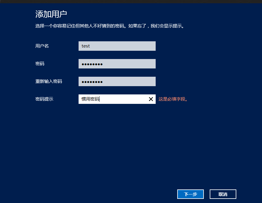 6、最后给账户起名字,设置密码和密码提示信息,即账号创建完毕