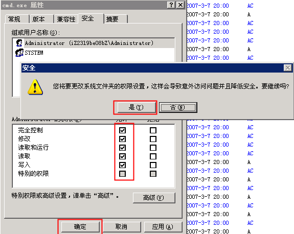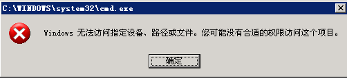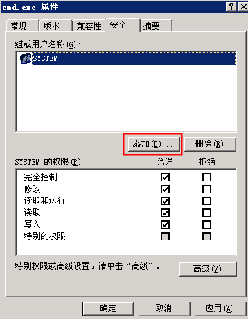 如何解决ECS windows执行cmd.exe提示"没有合适权限访问这个项目" windows server 2003打开cmd.exe提示"无法访问",如图: 这种报错的原因一般都是由于权限不对所导致的。 用户可以通过以下方法尝试解决问题: 1、登录主机,并依次打开C:\Windows\System32\右键选择cmd.exe属性,如图所示: 2、在属性窗口,点击"添加",如图所示: 3、在弹出的窗口中录入当前登陆的账号,如administrator,点击检查名称,如图所示: 4、系统自动修改对象名称,添加上主机名\,如图所示: 5、确定,勾选"完全控制"再次确定,弹出如下提示,点击"是",确定,如图所示: 6、再次打开cmd窗口,一般即可解决,如图所示: 如问题还未解决,请联系售后技术支持。