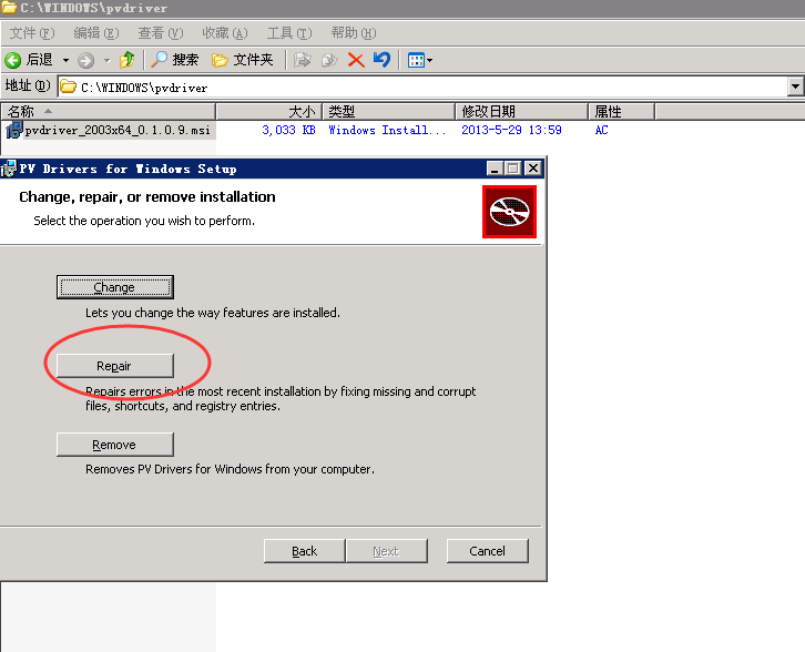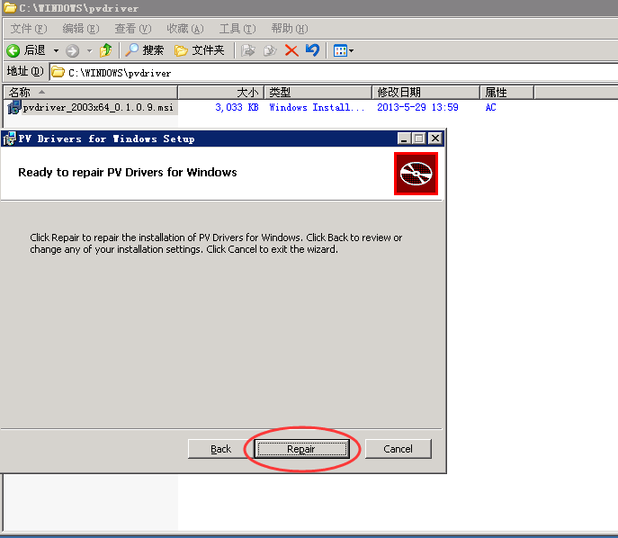 ECS windows 2003系统网卡驱动丢失怎么办 用户由于某些操作导致2003系统网卡驱动丢失 系统内部可以手工安装下,位置在C:\windows/pvdriver 下,具体操作如下图所示: 1、双击 “pvdriver_2003x64_0.1.0.9.msi” 2、“Next” 下一步 3、“repair”下一步 4、“repair”下一步 等待完成即可,安装后提示重启即可恢复网卡正常。 如果问题未解决请联系阿里云售后