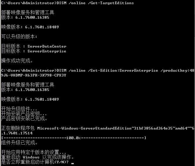 Windows 2008标准版更改为企业版步骤 ECS Windows 2008标准版往往会有很多服务和硬件上的限制,如果需要将标准版更换为企业版而应用已经部署,无法通过更换系统盘来更换系统版本。 那么这里还有另外一种方式,可以通过命令行升级系统,将系统版本由标准版升级为企业版,命令 DISM /online /Get-TargetEditions 查询可升级版本。 执行命令 DISM /online /Set-Edition:ServerEnterprise /Productkey:489J6-VHDMP-X63PK-3K798-CPX3Y 后执行升级任务,然后再多次重启后,系统版本就可以成功升级了。 备注:出于系统以及数据安全考虑,执行此操作前建议用户备份好系统盘快照。 如果问题还未能解决,请联系售后技术支持。