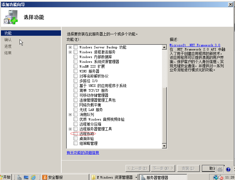 出现此现象说明系统的远程协助功能很可能没有安装,此时需要在服务器管理器中进行添加功能才可以,如图所示: