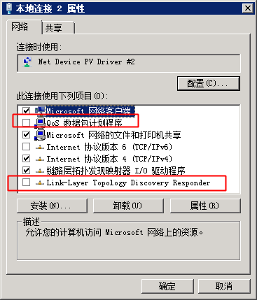 如何处理ECS Windows服务器公网带宽被限速(Link-Layer Topology Disconvery Responder驱动导致) 问题描述: ECS Windows服务器购买了50M公网带宽。但无论是从系统内部监控还是后端监控查看,公网带宽都是无法跑满的,带宽最高只能跑到4M。 问题分析: 阿里云在ECS外层,诸如网络层面、云盾安全层面等,对ECS出口(公网带宽)网络数据是没有任何限制的。此类问题一般是由于操作系统内部组件配置、或安装了相关网络控制软件所导致的。 问题分析解决: 1、排查系统内部是否安装了第三方网络管理软件,对网卡做了限速; 2、排查是开启了操作系统Qos网络管理配置,对网卡做了限速; 3、排查是否有第三方网卡驱动,步骤如下: 1)【运行】--执行“ncpa.cpl”打开网络管理; 2)双击公网IP所在网卡(默认为"本地连接 2"),选择【属性】; 3)双击【Internet 协议版本4(TCP/IPv4)】; 4)取消【Link-Layer Topology Disconvery Responder】和【QoS数据包计划程序】的勾选; 5)依次点击【确定】--【关闭】后,重新进行网络测试验证是否恢复正常,如若正常即问题已解决。 如问题还未解决,请联系售后技术支持。
