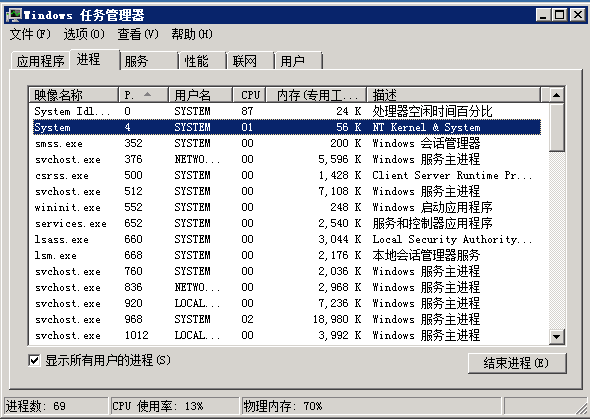如何检查ECS Windows 80端口是否被NT Kernel & System进程占用 Windows Server中,有时客户启动web服务(比如Apache或Nginx)时会无法正常启动,提示80端口被占用。 这时候用户可以打开Windows 命令行窗口,输入 netstat -ano | findstr "80" 来检查是哪个进程在占用80端口。 如果发现占用端口的是一个PID(进程ID)为4的进程,而并非普通的一个应用程序,可以通过以下方法来进一步分析: 用户可以通过任务管理器核实PID为4的这个进程的名称(如果任务管理器中没有PID列,可以启动任务管理器>>查看>>选择列>>勾选 PID,即可看到PID列) 如果这个进程名为NT Kernel & System,则需要检查一下“开始”->“管理工具”->“服务”中,是否有Web Deployment Agent Service (MsDepSvc) 或 SQL Server Reporting Services服务, 如果有这两个服务,可尝试停止这两个服务,再尝试启动web服务一般就可以解决问题了。 如果问题还未能解决,请联系售后技术支持。
