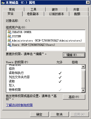 出现以上所述错误,一般是由于安全设置等操作,导致ECS Windows 系统盘(C盘)根目录默认权限变更导致的。 用户可以尝试通过如下方式修改相关权限配置后,再尝试重新安装补丁,步骤如下所示: 1)打开资源管理器,在系统盘(C盘)盘符上右击,选择【属性】; 2)切换到【安全】选项卡,如下图所示,核对是否有 "Users"组的默认权限配置: 读取和执行、列出文件夹、读取、特殊权限。 3)如果没有上述默认配置,则点击【编辑】,然后点击【添加】,输入"Users"后点击【确定】; 4)然后按照默认权限配置,再次点击【确定】应用配置即可; 5)尝试重新安装KB3042553补丁(注意: 安装成功后需要重启生效); 6)再次到【云盾控制台】--【安全体检】进行重新扫描,查看漏洞是否修复成功; 如问题还未解决,请联系售后技术支持。