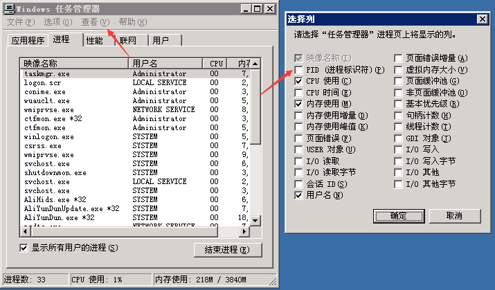 ECS Windows系统如何使用netstat查询连接数及进程PID 点击开始菜单,在运行框输入cmd进入命令行提示页面,如图所示: 通过netstat –ano命令查询结果显示如下: 其中的参数说明: Proto :协议 Foreign Address:外部地址 Local Address :本地地址 PID:windows进程编号 State:状态 这里我们要注意PID,即windows进程编号。之后我们在任务管理器,利用PID查询对应进程。 我们打开任务管理器,在进程选项卡,点击上方查看,选择列。这里面会有很多信息,比如i/o也可以通过这里点击查看等,这里我们选择PID进程标识符。 对比PID进程编号,即可找到对应占用端口进程。 在进程非常多的时候,可以netstat –ano |find “ 命令筛选 统计占用80端口有多少个连接数 netstat –ano |find /C “端口” 命令统计数量。