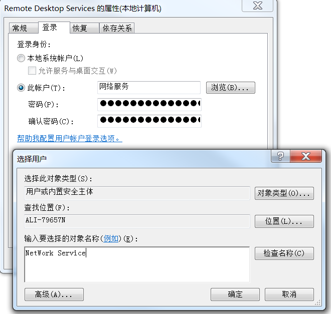 如何处理ECS Windows系统启动服务报错:1079 问题描述: Windows系统启动部分服务时,会出现报错,如下所示: Windows 无法启动 XX 服务(位于本地计算机上)。 错误1079: 此服务的账户不同于运行于同一进程上的其它服务的账户。 问题分析: 出现该错误通常是由于相应服务的【登录身份】配置错误导致。 解决方法: 1、双击要配置的服务,或右击该服务选择【属性】,打开服务属性配置对话框; 2、切换到【登录】选项卡; 3、对于一般的Windows系统服务,有如下操作: 1)【登录身份】选择【此账户】。 2)然后点击右侧的【浏览】按钮,【输入要选择的对象名称】下面输入"NetWork Service"后,点击确定; 注:可在一台能正常启动该服务的计算机上,参考相关参数配置。 4、点击【应用】使配置生效; 5、重新启动相应服务,验证问题是否解决,如下图所示: 如问题还未解决,请联系售后技术支持。