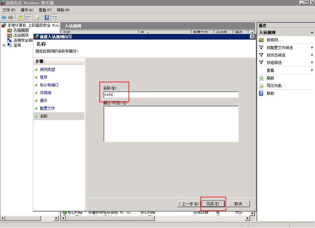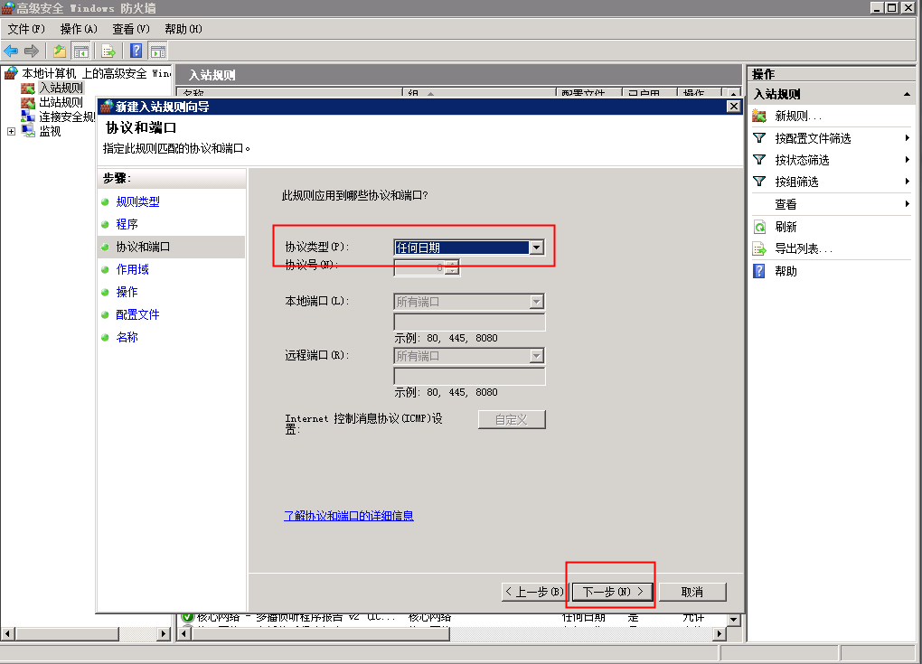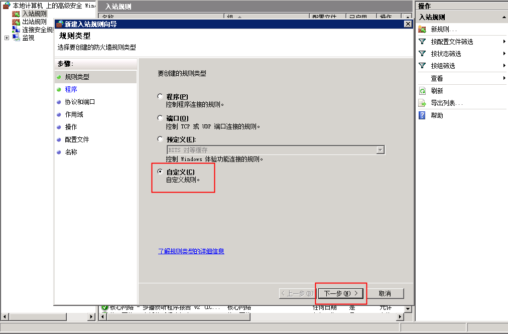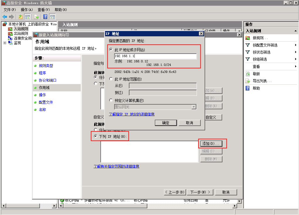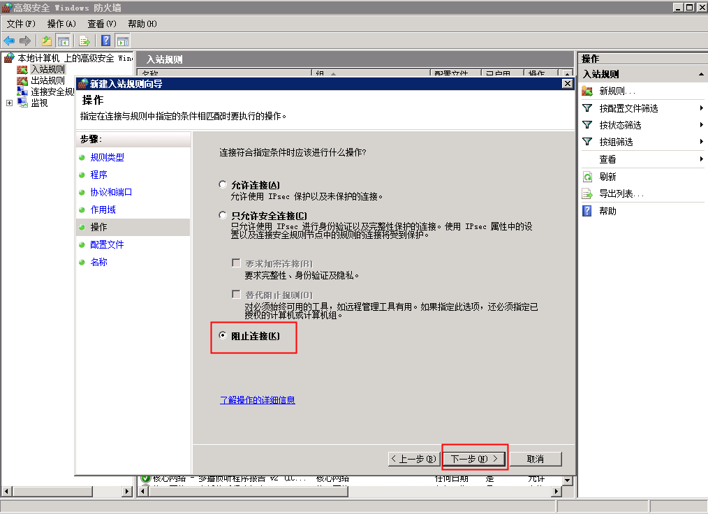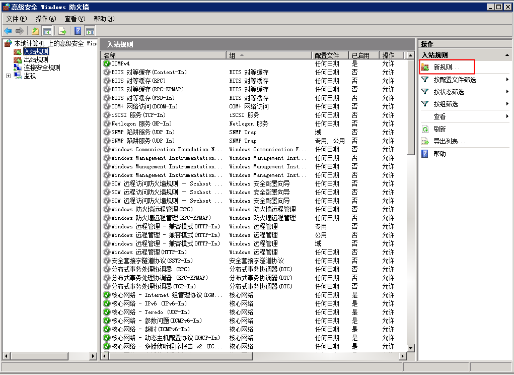 ECS Windows2008如何通过系统防火墙限制外部IP访问 Windows2008通过系统防火墙限制外部IP访问设置方法,步骤如下所示: 1、首先远程登陆服务器,打开windows防火墙服务,如图所示: 2、然后点击入站规则,新规则; 3、然后选择自定义,下一步; 4、这里我们默认选择所有应用程序,也可以选择自定义自己的程序,如图所示: 5、将协议类型选择任意; 6、选择需要禁止外部访问添加的ip地址,点击添加; 7、然后选择阻止连接; 8、应用规则默认选择所有; 9、最后起个名字,便于查看,设置即可完成。