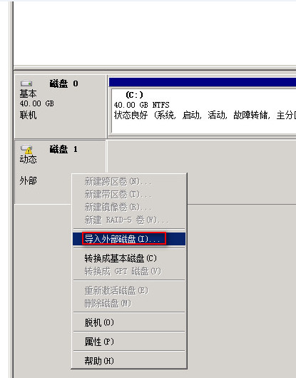 如何解决ECS windows服务器更换系统后动态磁盘无法识别 问题描述: 用户使用ECS动态磁盘,在更换操作系统时,经常会遇到动态磁盘无法识别问题。如从Window server 2003 R2更换为Windows server 2008 R2后,动态磁盘在系统的磁盘管理中无法识别,用户需要在【磁盘管理】中执行【导入外部磁盘】才能使用。 解决方法: 1. 首先在阿里云控制台中对需要做【导入外部磁盘】的数据盘,创建快照,避免用户因为误操作导致数据丢失。 创建快照方法,点此查看即可。 2. 然后在系统中点击【开始】菜单--【运行】,在运行中执行命“compmgmt.msc”, 打开计算机管理器。 3. 执行【导入外部磁盘】的操作: 在对应的磁盘上,点击鼠标右键,选择【导入外部磁盘】操作,如下图所示: 4.最后 验证磁盘是否能正常使用就可以了。 打开【计算机】查看是否出现了对应的磁盘,磁盘能否正常打开并使用。 如问题还未解决,请联系售后技术支持。