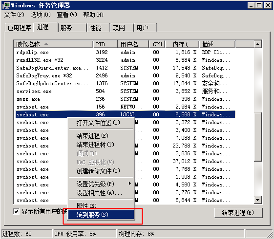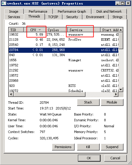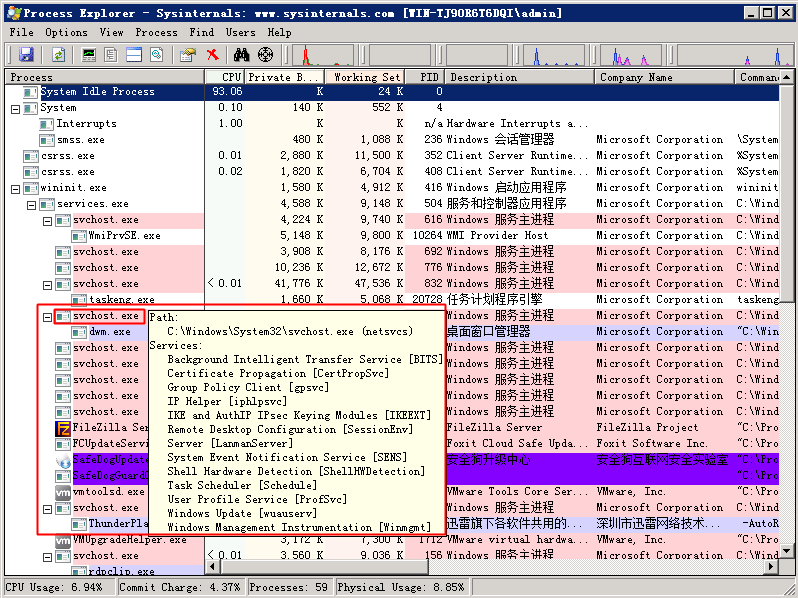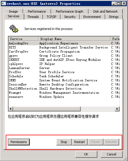 关于ECS Windows环境svchost进程占用过高系统资源问题 问题描述: ECS Windows系统内名为【svchost.exe】的进程,CPU或内存资源使用率一直居高不下,导致系统卡顿,影响正常使用。 svchost.exe什么是 ? svchost.exe 是计算机上的一个进程,这个进程是Windows上用于执行各种功能的其它单独服务的宿主。例如,Windows Update服务就是挂载到svchost.exe 进程宿主下的服务。 可以有多个 svchost.exe 的实例在计算机上运行,其中每个实例都包含不同的服务。svchost.exe 的一个实例可能有单个服务或多个服务。 问题定位的方法: 用户可以尝试通过如下方法定位出占用过高系统资源的具体程序或服务: 1. 使用procexp做深入分析 通过任务管理器只能定位出相应svchost进程下挂载的服务,但无法查看具体是哪个服务占用了过高的系统资源。 使用微软官方Sysinternals Suite安全组件包中的procexp工具,可以做进一步的排查分析,定位出具体占用过高系统资源的服务、进程和关联文件等。 1) 到官方下载procexp 。 2) 打开procexp,如下图所示,将鼠标指向占用资源异常的svchost进程,气泡提示框就会相应显示出该svchost进程下挂载的相应服务。 3) 双击相应的svchost,弹出的进程属性对话框。 4) 切换到“Services“选项卡,也同样能查看到相应svchost进程下挂载的相关服务。并能对相应服务进行权限设置、停止、重启、暂停等快捷操作。 5) 切换到“Threads“选项卡,能看到相应svchost进程下占用最高资源的线程的CPU使用率和归属的服务。 6) 确定了相应服务或者线程归属动态链接库文件后,用户再做相应的处理即可。 2. 使用任务管理器做简要分析 打开系统自带的【任务管理器】,快速判断出相应svchost进程下挂载的对应服务: 1) 通过右键单击任务栏,然后单击“启动任务管理器”,打开“任务管理器”。 2) 切换到“进程”选项卡。 3) 单击“显示所有用户的进程”,若系统提示您输入管理员密码或进行确认,请键入该密码或提供确认。 4) 右键单击资源使用过高的 svchost.exe实例,然后单击“转到服务”按钮,与进程关联的服务将在“服务”选项卡上突出显示。 如问题还未解决,请联系售后技术支持。
