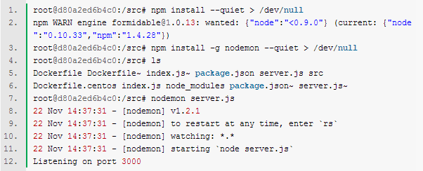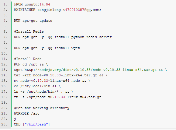 在继《阿里云部署Docker》之后,我决定系统的出一系列《Docker从入门到精通》的深度记录文章,这源于有一天图灵出版社的一个编辑联系我,问我有没有兴趣写Docker方面的书籍进行出版。 本文的目标是建立一个Docker web app。这样,你即可直观的感受,docker是怎样部署一个web应用。 首先,我们建立一个空目录来存放我们需要的文件。 我们建立的是一个node.js的web服务应用。我们需要在当前目录下建立如下三个文件。 1).gitignore 2)package.json 3)server.js 配置Dockerfile 我们需要通过Dockerfile来配置我们的docker镜像。 有了Dockerfile之后,就可以通过docker build来建立我们的镜像。 这里需要说明的是,你需要灵活的根据你的ubuntu真实的环境来变化中间的指令。例如,当我们第一次执行的时候,告诉我找不到python redis-server,我想应该是我的apt 源太out了,所以我加了RUN apt-get update.就解决了这个问题。 当我wget的时候,说没有这个指令,那么我就得安装wget.而nodejs的地址,也是我去从nodejs的官网查找的。所以碰到问题,具体问题具体分析。 查看我们建立的镜像。 启动我们的镜像: 这时我们已进入到了这个镜像启动的容器里面了。 执行下列命令 这个时候用浏览器打开:http://localhost:3000/,会的到如下结果。 原文出自:http://blog.csdn.net/minimicall/article/details/41391241