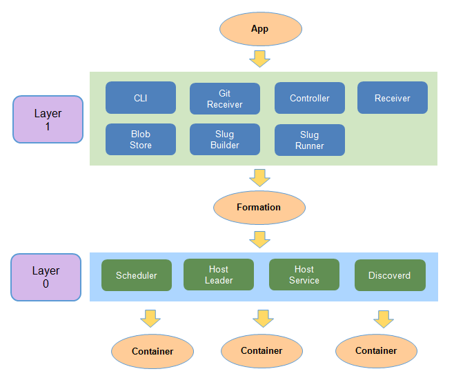 Flynn是一个开源的PaaS平台,可自动构建部署任何应用到Docker容器集群上运行,其功能特性与组件设计大量参考了传统的PaaS平台Heroku。本文旨在从使用动机、层次架构、基本对象、功能组件、基本工作流这几个方面对Flynn做总体的介绍。 为什么需要Flynn 为了便于理解Flynn的作用与功能,让我们先来看看应用程序从开发到构建再到部署再到运行分别需经历的几个实体状态: 更具体一点,以一个Java程序为例来描述: 进程:运行Java程序的实体。一个Java程序可以起多个进程,每个进程启动不同的主类(实现了main()方法的类,一个JAR包可以包含多个主类)。 源代码:包括*.java、log4j.properties、pom.xml等文件。 部署配置:比如每个进程的启动命令、环境变量、系统属性等。通常,这些配置会写在一个启动脚本里面。 发布包:源代码被编译打包后生成一个JAR包,这个就是发布包。 引入Docker后,发布包变成封装了JAR包与JDK环境的镜像,进程变成在相互隔离的容器里运行。但从源代码到镜像、从镜像到运行容器这两步转换过程需要用户人工的操作。尤其是后者的转换,涉及到集群资源调度、配置管理、自动部署、容器管控等一系列的复杂流程。更进一步,在运行阶段还涉及扩缩容、错误处理、日志查看、运行监控等运维需求,若全部人工操作将耗费巨大的工作量。 此时类似Flynn这样的PaaS出场了,基于Docker之上进一步封装了整个构建、部署、运行工作流,使得用户只需要简单地提交代码就可以完成开发到运行的快速转换: 开发到构建:用户通过git提交源代码,由Flynn自动构建镜像,并提供版本的管理——用户可以创建新版本(提交新代码或修改部署配置)、回滚老版本等。 部署到运行:Flynn自动选择运行机器(如阿里云主机),为每个进程副本部署启动单独的容器,并提供进程的管理——用户可以做扩缩容、查看日志、监控状态等。 Flynn的基本对象 下面我们来看看发布包、部署配置、进程这三个实体在Flynn中是怎样抽象的。如下图所示是其基本对象的关系描述: App:表示一个应用,所有其他对象都是围绕App而展开。 Artifact:表示应用的发布包,实际上对应一个Docker镜像。 Formation: 是应用运行态的抽象表示。它在Release的基础上增加了可变(mutable)的动态配置,即每个进程的副本(replica)个数。 Job: 是进程副本的抽象表示,每个Job对应一个运行容器。因此,在后文中可以看到,Job是资源调度的基本单元。 Process:表示应用的进程。通过一个镜像可以启动多个不同的进程,每个进程运行在自己单独的容器里。 Release:是应用发布态的 抽象表示。它在Artifact的基础上增加了一些不可变(immutable)的静态配置,比如每个进程的启动命令行、环境变量、绑定端口、等。要修改 这些配置,需要生成一个新Release。Release这种不可变性是为了方便做Rollback,即应用随时可以回退到之前的Release。 Flynn的层次架构 如下图所示,Flynn的架构自下而上分为两个层级——Layer 0和Layer 1。简单地理解,可以认为Layer 1负责接受用户请求,封装成应用的运行指令,再由Layer 0解决在哪里运行、以什么方式运行的问题。具体一点讲,Layer 0面向的对象是Formation,负责将底层的集群资源封装成可执行Formation的一台主机;Layer 1面向的对象是App,负责将App从源代码构建成Artifact,进而封装成Formation提交给Layer 0去执行。 这种分工明确的层次划分,使整个系统非常灵活,相互松耦合,便于任意组件的替换(比如,甚至可以把Layer 0替换成不用容器去执行Formation)。 Flynn的功能组件 下面总结一下组成两个层级的各个组件及其功能(所有组件自身都可以运行在容器里): Layer 0 Discoverd:基于etcd的服务发现模块,提供容器间的发现机制。实际上,Flynn自身的组件间通讯也是通过Discoverd来相互发现的。 Host Leader:一个特殊的Host Service,做为"cluster leader",负责维护整个集群的状态信息(比如有哪些机器、每台机器上运行的Job等),并提供给Scheduler用于资源调度。 Host Service: 运行在集群每台机器上的agent,负责管控运行在本机(如阿里云主机)的容器,并收集运行状态信息。 Scheduler: 资源调度器,定期从Layer 1获取Formation的更新,再根据每个Formation的部署配置生成一个个的Job,最后从集群中选择合适的机器去运行这些Job。 Layer 1 BlobStore: HTTP文件服务器,用于上传/下载slug包。 CLI:提供给用户使用的命令行工具。 Controller:为Flynn系统的入口, 封装了核心对象(比如app/artifact/release/job)的增删改查操作,以RESTFul接口方式提供给外部客户和内部组件调用。它维 护的REST对象将持久化到postgre数据库。Layer 0的Scheduler就是通过Controller的接口来获取Formation更新的。 GitReceiver:接受用户git push源代码的SSH服务器。接受到git push后将触发Receiver。 Receiver:基于buildpack机制, 利用SlugBuilder从源代码包构建slug包。buildpack和slug都是从Heroku借鉴过来的概念。简单地理解,buildpack 是一组用于构建源代码的脚本,buildpack可以多种多样,每个buildpack可构建某种类型的源代码,这种类型可以是不同的语言(比如 Java、PHP)、不同的构建方式(比如maven、gradle);而slug则是buildpack构建生成的部署包,包含了编译输出文件、依赖库 文件等运行环境。 SlugRunner:运行slug包,会从BlobStore下载应用的slug包。 SlugBuilder:接受源代码包,基于某种buildpack构建生成slug包。选择哪一种buildpack可以显式地指定,也可以由SlugBuilder根据源文件自动匹配。 Flynn的工作