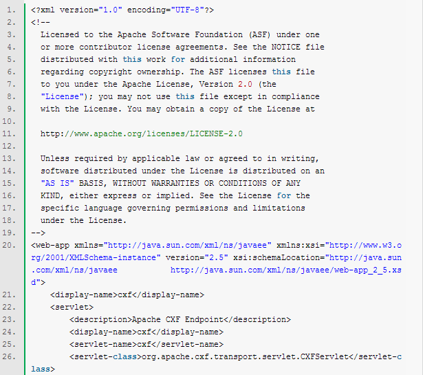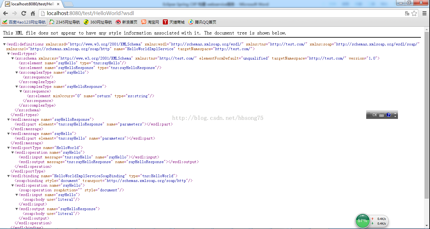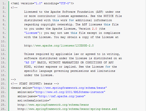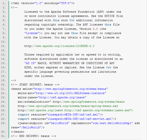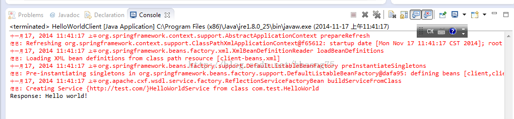 一、 软件准备 CXF 3.0.2 Eclipse 4.2.1 Maven 2.2.1 Spring 3.2.6 二、 步骤 1. 新建web工程,利用maven管理,如下: 工程名为test,完成以后,项目结构如下图: src/main/java 准备放 java 程序; src/main/resources准备放各类资源文件。 2. 添加代码 1) 定义服务接口 因为只是一个webservice的实验程序,所以很简单,只有一个服务方法: sayHello(),利用 @WebService注解来声明这是一个webservice的接口。 2) 实现服务类 完成java代码添加后的项目结构如下: 3. 添加Spring-CXF 配置 在项目 src/main/webapp/WEB-INF 目录下新建XML定义:cxf-servlet.xml如下: 该定义文件利用spring和CXF的功能,发布一个ID为helloWorld,实现类为com.test.HelloWorldImpl,发布 相对路径为 /HelloWorld(对应绝对目录为: http://host:port/{WebAPPName}/HelloWorld)的 webservice。 因为我们需要用到CXF来做webservice,右键点击项目中的POM.XML,添加apache-cxf依赖。 4. Web应用配置 修改 src/main/webapp/WEB-INF 目录下的web.xml文件 该文件实际上是定义了处理webservice的CXF Servlet的映射关系。 完成步骤3和4以后的工程目录如下: 5. 编译打包 利用maven(package -X)编译打包成test.war (在Eclipse上右击工程名 Run as -> Maven build) 6. 将步骤5生成的test.war部署到tomcat服务器(如阿里云服务器)上 7. 访问测试: 在浏览器上输入:http://localhost:8080/test/,出现如下画面就成功了: 点击WSDL链接: 8. 编写webservice client端代码 1) 首先通过 Spring 与 CXF 的配置来定义 Web Service 的客户端 Bean,在 src\main\resources 目录下创建client-beans.xml 配置文件: 需要注意的是,该配置文件中的 address需要写成发布服务的绝对路径。 2) 编写客户端java代码: HelloWorldClient.java 注意,代码中HelloWorldclient = (HelloWorld)context.getBean("client"); 的client需要与"client-beans.xml"中的 bean id一致才能找到这个服务。 现在的项目结构如下: 3)连接测试 在eclipse中直接按HelloWorldClient运行 Run as -> Java Application: 输出的Hello world! 即是我们发布的HelloWorld的方法 sayHello()的输出!这说明从服务发布到客户端连接都成功了。 原文出自:http://blog.csdn.net/hbsong75/article/details/41207585