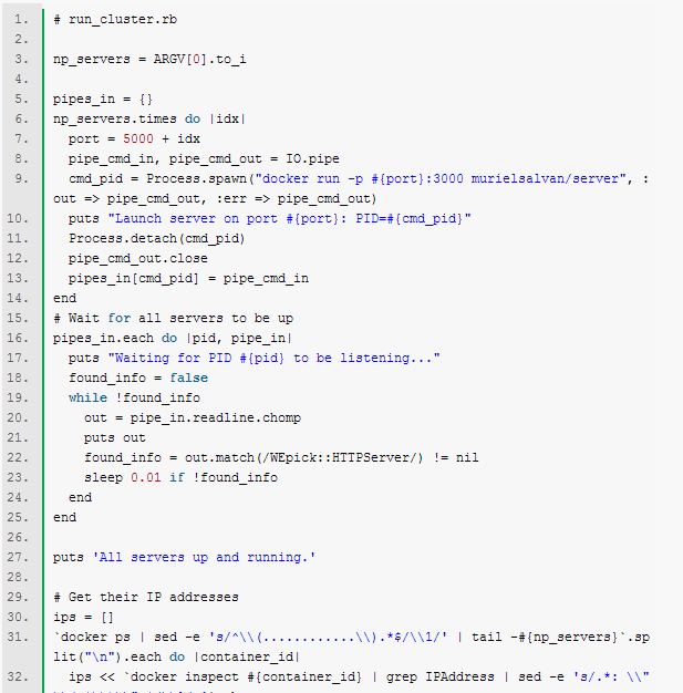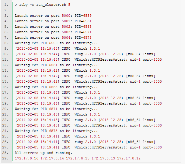浅析基于Docker的Rails集群+Ruby负载均衡代理 我打算做一个比较酷的使用Docker的例子:一个Rails集群,以及集群前面的一个Ruby负载均衡服务。我曾想过使用若干不同的机器(每台机器都有自己的IP地址和端口)来运行同样的Rails服务,然后在外部配置一台负载均衡的代理服务器,在各Railf服务之间进行请求分配。 不过使用Docker的话,在一台机器上就能够模拟集群环境了。如下图所示: 这里我们将演示一下怎样来创建这个集群环境。 你能够从我的Github项目上下载所有这次测试的源代码。 一、创建Docker镜像 首先我将创建两个Docker镜像,1个用来运行Rails服务,1个运行Ruby代理服务。 1.首先我制作了一个可信的Docker构建(Trusted Docker build),构建脚本也在我的Github上( Github project docker-ruby )。使用这个构建脚本创建的镜像为 murielsalvan/ruby ,它基于Ubuntu Precise,并且安装了Ruby 2.1.0p0。如下图所示: 2.接着我基于murielsalvan/ruby来创建一个Docker容器,用来执行一个bash shell,然后在里面安装Rails并创建一个Rails应用程序。这个应用程序只有一页,它将打印出它所在服务器的主机名和IP地址(集群里的每台Rails服务都有不同的主机名和IP地址)。你能够从这里查看这个测试程序的源代码。这步的最后,我将把这个容器提交,生成一个新的镜像,并命名为murielsalvan/server,这个镜像执行的时候,会启动Rails服务,并监听3000端口号(容器内的端口号)。如下图所示: 3.最后我们来基于murielsalvan/ruby创建第二个容器。这个容器也是启动一个bash然后安装一个Ruby代理服务(我用了 em-proxy,非常不错的东西,值得一试)。这个Ruby代理服务将接收一个地址列表作为输入参数,并且创建一个基于随机策略的负载均衡服务,轮询所有给定的IP地址以及3000端口。这个代理服务的源代码能够在这里查看。最后我把这个容器也做了提交操作,生成了一个新的镜像 murielsalvan/proxy,它也将监听3000端口。如下图所示: 二、运行Rails cluster 在所有的镜像都创建完成之后,我们就能够启动容器了。我写了个小脚本来启动所有需要运行Rails服务的容器,它接收一个N参数,为Rails服务器个数。等Rails服务全部启动完成后,这个脚本会打印出这些服务的IP地址列表。 这个脚本的另一个工作就是将运行Rails服务的容器内的3000端口,绑定到本机的5000+i 端口上,这样就能够非常方便的透过代理服务直接通过 wget -S -O – http://localhost:5000 命令来确认每台Rails服务是否运行正常。如下图所示: 这段代码执行后输出结果如下图所示,请注意最后的那IP地址,这些地址是Rails服务所监听的IP地址,我们在后面的Ruby代理服务器中会使用到这些地址。如下图所示: 三、启动Ruby代理 同样,我们在这里也通过一段Ruby代码来完成启动代理服务器的工作如下图所示: 这段代码将启动运行Ruby代理服务的Docker容器,其执行结果如下图所示: 这将启动Ruby代理服务程序,并且监听3000端口。(请先忽略 上面的警告信息吧,也许em-proxy需要做一些清理操作吧 :-)) 四、打开浏览器 服务程序都启动之后,就能够打开浏览器访问了。输入网址 http://localhost:3000,能够确认返回结果里的主机名和IP地址。为了确保每次请求都会发给代理服务来处理,要在每次请求这个网址的时候先清空一下缓存(强制刷新)。 下面的图是两次请求的结果,从中我们能够看出,两次请求是分别由两台不同的Rails服务器返回的。 刷新浏览器之后: 如何,是不是很简单的一种Rails集群方案?你也能够在自己的机器上尝试一下。 我个人的测试环境如下:64位的Windows 7 主机,然后通过VirtualBox运行了Ubuntu 14.04 Alpha,所有的操作都在虚拟机里进行。性能也还算说的过去(每个请求的响应时间都低于1秒)。 原文出自:https://docker.cn/p/rails-cluster-with-ruby-load-balancer-using-docker-zh