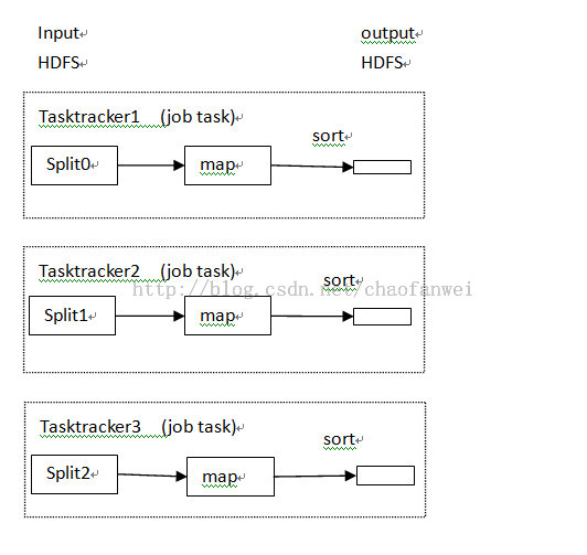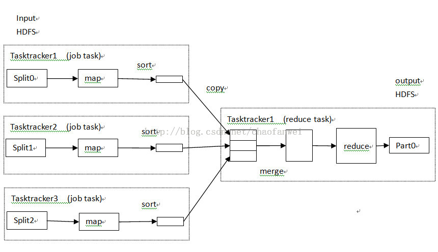 关于大数据时代之hadoop:了解hadoop数据流(生命周期)的讲解 想要了解hadoop,首先就必须需要先了解hadoop的数据流,就像了解servlet的生命周期似的。hadoop是一个分布式存储(hdfs)和分布式计算框架(mapreduce),但是hadoop也有一个很重要的特性:hadoop会将mapreduce计算移动到存储有部分数据的各台机器上。如下图所示: 一、术语 MapReduce 作业(job)是客户端需要执行的一个工作单元:它包括输入数据、mapreduce程序和配置信息。hadoop将作业分成若干个小任务(task)来执行,其中包括两类任务:map任务和reduce任务。 有两类节点控制着作业执行过程:一个jobtracker及一系列tasktracker。 jobtracker通过调度tasktracker上运行的任务,来协调所有运行在系统上的作业。tasktracker在运行任务的同时将运行进度报 告发送给jobtracker,jobtracker由此记录每项作业任务的整体进度情况。如果其中一个任务失败,jobtracker能够在另外一个 tasktracker节点上重新调度该任务。 二、输入 hadoop将mapreduce的输入数据划分成等长的小数据块,称为输入分片(input split)或简称分片。hadoop为每个分片构建一个map任务,并由这个任务来运行用户自定义的map函数从而处理分片中的每条记录。 对于大多数作业来说,一个合理的分片大小趋向于HDFS的一个块的大小,默认是64M,不过能够针对集群调整这个默认值。分片的大小一定要根据运行的任务来定,如果分片过小,那么管理分片的总时间和构建map任务的总时间将决定着作业的整个执行时间。 hadoop在存储有输入数据的节点上运行map任务,能够获得最佳性能,这就是所谓的数据本地化优化。 因为块是hdfs存储数据的最小单元,每个块能够在多个节点上同时存在(备份),一个文件被分成的各个块被随机分部在多个节点上,所以如果一个map任务 的输入分片跨越多个数据块,那么基本上没有一个节点能够恰好同时存在这几个连续的数据块,那么map任务就需要首先通过网络将不存在于这个节点上的数据块远 程复制到本节点上再运行map函数,那么这种任务显然效率非常低。 三、输出 map任务将其输出写入到本地磁盘,而非HDFS。这是因为map的输出是中间结果:这个中间结果有reduce任务处理后才产生最终结果(保存在hdfs中)。而一旦作业完成,map的输出结果能够被删除。 reduce任务并不具备数据本地化优势:单个reduce任务的输入通常来自于所有的mapper任务的输出。reduce任务的输出通常存储于HDFS中来实现可靠存储。 四、数据流 作业根据设置的reduce任务的个数不同,数据流也不同,但大同小异。reduce任务的数量并非由输入数据的大小决定的,而是能够通过手动配置指定的。 A、单个reduce任务,如下图所示: B、多个reduce任务 如果是多个reduce任务的话,则每个map任务都会对其输出进行分区(partition),即为每个reduce任务创建一个分区。分区有用户定义的分区函数控制,默认的分区器(partitioner) 通过哈希函数来分区。 map任务和reduce任务之间的数据流称为shuffle(混洗)。如下图所示: C、没有reduce任务 当然也有可能出现不需要执行reduce任务的情况,即数据能够完全的并行。如下图所示: D、combiner(合并函数) 顺便在这说下combiner吧,hadoop运行用户针对map任务的输出指定一个合并函数,合并函数的输出作为reduce函数的输入。其实合并函数 就是一个优化方案,说白了就是在map任务执行后在本机先执行合并函数(通常就是reduce函数的拷贝),减少网络传输量。 原文出自:http://blog.csdn.net/chaofanwei/article/details/39695743