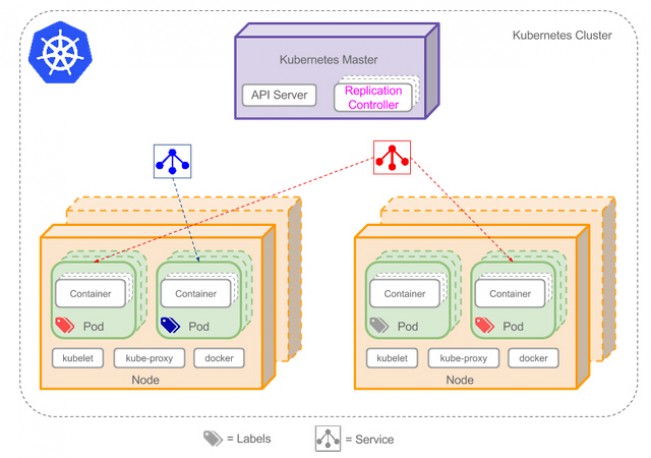 集群拥有一个Kubernetes Master(紫色方框)。Kubernetes Master提供集群的独特视角,并且拥有一系列组件,比如Kubernetes API Server。API Server提供可以用来和集群交互的REST端点。master节点包括用来创建和复制Pod的Replication Controller。