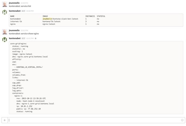 在运维领域中一个较新鲜也比较有意思的技术是ChatOps, 即也就是通过与一个控制机器人对话来做运维工作。在本文中Digia 高级架构师Jussi Nummelin介绍了他在这方面的一些实践。 作者介绍:Jussi Nummelin, Digia 高级架构师。Jussi当前正在将客户和内部的项目进行Dockerizing。他的Twitter帐号@JNummelin。 ChatOps 近来有趋势将团队协作搬到在线消息应用上, 例如Slack、Flowdock 或者其它类似工具。一些组织甚至走的更超前,已经将他们的一些运维工具集成到这些消息应用里。 实际上这项工作比听起来简单的多,因为这些工具提供了相当直白的API和客户端库很方便做集成。当我发现情况如此时实在忍不住一试。: ) 集成 机器人是使用Node.js和Slack的Node客户端写的。Slack客户端简化了我的工作,因为它提供了几个简单的回调来对进来的消息做反馈。接下来的一步是解决怎样与Kontena做集成。Kontena 本身已经有了一个相当好的命令行工具,我真的不想再另外写一个选项解析和其它类似的“样板“工具。所以这个Node.js APP就直接使用Kontena命令行工具来集成Kontena grid。由于Slack客户端使用WebSocket并且机器人来管理连接(与Kontena的模型一致), 你即可在任何地方运行它了。我们现在正在我们的Kontena grid中运行它。 ;) 通过Slack消息控制Kontena 作为Kontena和 Slack的用户,我觉得如果能够使用Slack来控制我的Kontena grid将会是十分酷。优点就是运维现在对于整个团队来说都是透明的,因为与Kontena的通讯都是通过与一个cahnnel里面的机器人对话来完成的。与同事一起做调试也变得十分的简单,只需要你们建立一个私聊的会话然后邀请机器人加入就行了。通过这种方式你们两人都可以看见与Kontena grid实时的控制流。 与机器人交互 在Slack上控制机器人与普通的对话无异。只需要邀请机器人加入你的channel或者给它发一个1对1的消息。 kontenabot: service list 之后机器人便会将命令结果返回。因为是使用命令行工具做的集成, 所以机器人使用的命令与命令行工具里面的一模一样。以下是几个例子: 在容器中运行机器人 我们已将机器人做成了Docker 镜像, 所以现在你要搭的话也相当容易。在Slack上创建一个新的机器人集成来获得所需要的api token。 在命令行上指定所需的token(slack 和kontena都要有)及其他的选项作为环境变量,然后就搞定! docker run -d -e SLACK_TOKEN=xoxb-1243576874-XXXXXXXXXXXXXXXXXXX \ -e KONTENA_TOKEN=kontena-token -e KONTENA_URL=https://192.168.100.100:8443 \ -e KONTENA_GRID=my-grid -e SSL_IGNORE_ERRORS=true -e BOT_NAME=kontenabot \ -e ALLOWED_USERS=user1,user2 --name kontenabot jnummelin/kontena-slack-bot:latest 在上面的例子中我们指定了SSL_IGNORE_ERRORS 由于测试环境我们的证书是自签名的。需注意的一点: 在容器里面和slack的配置里面对机器人命名要一致。这样机器人就知道你是发消息给一个特定的bot。ALLOWED_USERS 这个列表配置组织里哪些用户被允许控制机器人。 若你忽略的话, 任何用户就都可控制它。 关于细节请查看我们的GitHub仓库。 如果你有点子或者找到bug了, 请创建issue和PR, :)a 上一条: 怎样基于编排工具打造可扩展的容器环境 下一条: 怎样在web范围内实现微服务负载均衡