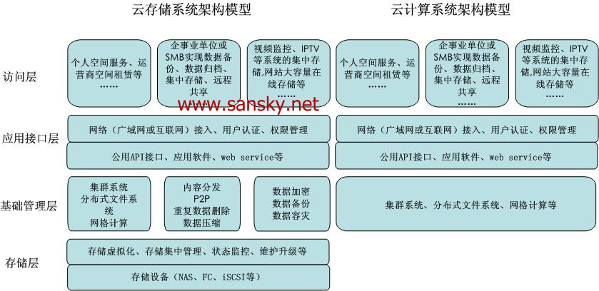 云计算是并行处理(Parallel Computing)、分布式处理(Distributed Computing)与网格计算(Grid Computing)的发展,是透过网络将庞大的计算处理程序自动分拆成无数个较小的子程序,再交由多台服务器所组成的庞大系统经计算分析后将处理结果回传给用户。通过云计算技术,网络服务提供者可在数秒内,处理数以千万计甚至亿计的信息,达到与“超级计算机”同样强大的网络服务。 云计算系统的建设目标是将运行在PC上、或单个服务器上的独立的、个人化的运算迁移到一个数量庞大服务器“云”中,由这个云系统来负责处理用户的请求,并且输出结果,它是一个以数据运算与处理为核心的系统,可以参考阿里云云计算系统。 云存储是在云计算(cloud computing)概念上延伸与发展出来的一个新的概念,是指通过集群应用、网格技术或者分布式文件系统等功能,将网络中大量各种不同类型的存储设备通过应用软件集合起来协同工作,共同对外提供数据存储与业务访问功能的一个系统。当云计算系统运算与处理的核心是大量数据的存储和管理的时候,云计算系统中就需要配置大量的存储设备,那云计算系统就转变成为一个云存储系统,因此云存储是一个以数据存储与管理为核心的云计算系统。 同云计算系统相比,云存储可认为是配置了大容量存储空间的一个云计算系统。下图是云计算与云存储的架构模型对比,如下所示: