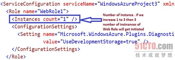 1、配置文件 到现在为止,我们已搞清楚了三种不同类型的角色。接下来,让我们看一看Windows Azure应用程序中包含的两种类型的配置文件。 图1 ServiceConfiguratiobn.cscfg 无需停止Azure服务,也可更新配置文件。这个文件主要包含下面这些信息: (1)角色的实例数 (2)不同类型设置的值。 图2 (1)实例数是指将要运行的Web角色或者Worker角色的实例的数量。 (2)在上面这个配置文件中,我们看到这个应用程序是使用本地开发存储器的。 ServiceDefinition.csdef 这个文件包含下面这些信息: (1)这个服务使用的各种角色。 (2)关于这个服务使用的“Certificates”的信息。 (3)这个服务的“Input End Point”和“Internal End Point”。 (4)这个服务需要的本地磁盘存储器。 (5)不同的角色使用的配置设置。 这个配置定义了Web角色或Worker角色。让我们一个一个地来理解这个文件中的每个小节。
