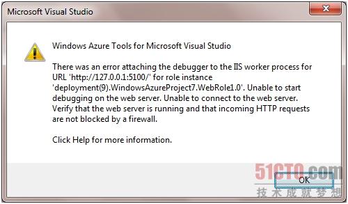 Windows Azure开发者任务之四:在Windows Azure SDK 1.3中挂载调试器的错误 我安装了Windows Azure SDK的1.3版本。试着创建了一个Azure的“Hello World”应用程序。 我按了“F5”,然后我得到了下面这个错误,如图所示: 图1 我尝试了“Ctrl+F5”;不使用调试器来运行就不会得到上面这个异常,但在浏览器中,我得到了服务不可用的错误。 我在这里发现了一些关于这个特定的异常的讨论:http://int.social.msdn.microsoft.com/Forums/en/windowsazuredevelopment/thread/45e01c3d-7c16-4ca7-999b-46cb20b38c1d 备选解决方案: (1)检查在“C:\Windows\Microsoft.NET\Framework64”文件夹下,是否有两个“V4.0”的文件夹。我检查了,我发现我只有一个叫作“v4.0.30319”的文件夹,因此这个建议并不适用于我所遇到的情况。 (2)打开命令提示符,然后运行“aspnet_regiis.exe –r”命令。我又试了一下,再一次“悲剧”了。 图2 (3)把目标框架从v4.0改成v3.5。我这样做了,“悲剧”再一次降临到了我的头上。 (4)从“ServiceDefinition.csdef”文件中删除“Sites”节点。很不幸,“悲剧”再次降临到了我的头上。 <Sites> <site name="Web"> <Bindings> <Binding name="Endpoint1" endpointName="Endpoint1" /> </Bindings> </site> </Sites> (5)测试一下,一个正常的,目标框架为4.0的Web应用程序是否可以在IIS中成功地发布?我试了一下,我可在IIS中成功地发布Web应用程序。因此我的IIS没有问题。 我彻底绝望了,然后重新启动了系统,奇迹出现了,居然一切正常了,我没有再看到那个调试器异常了。我不知道发生了什么,但这是我处理这个流行的异常的经验。 这对阿里云应用开发有所帮助。 上一条: Azure开发者任务之三:理解Azure应用程序(2) 下一条: 配置虚拟机的“规模”